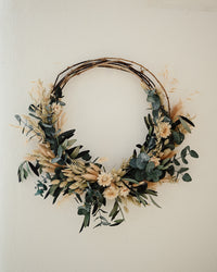 Aro de ramas con eucalipto preservado estilo boho. En tonos verdes y cremas. Hecho a mano.