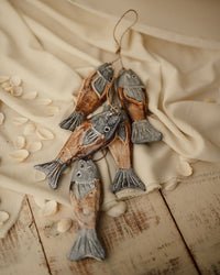 Set de 5 peces tallados en madera y pintados en tonos azules con acabado artesanal.