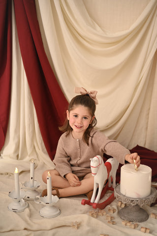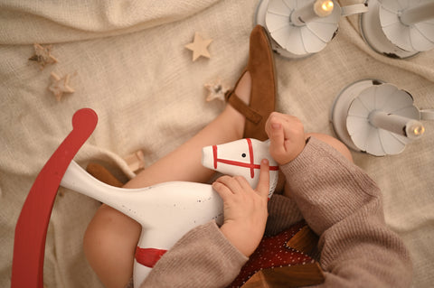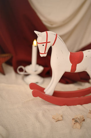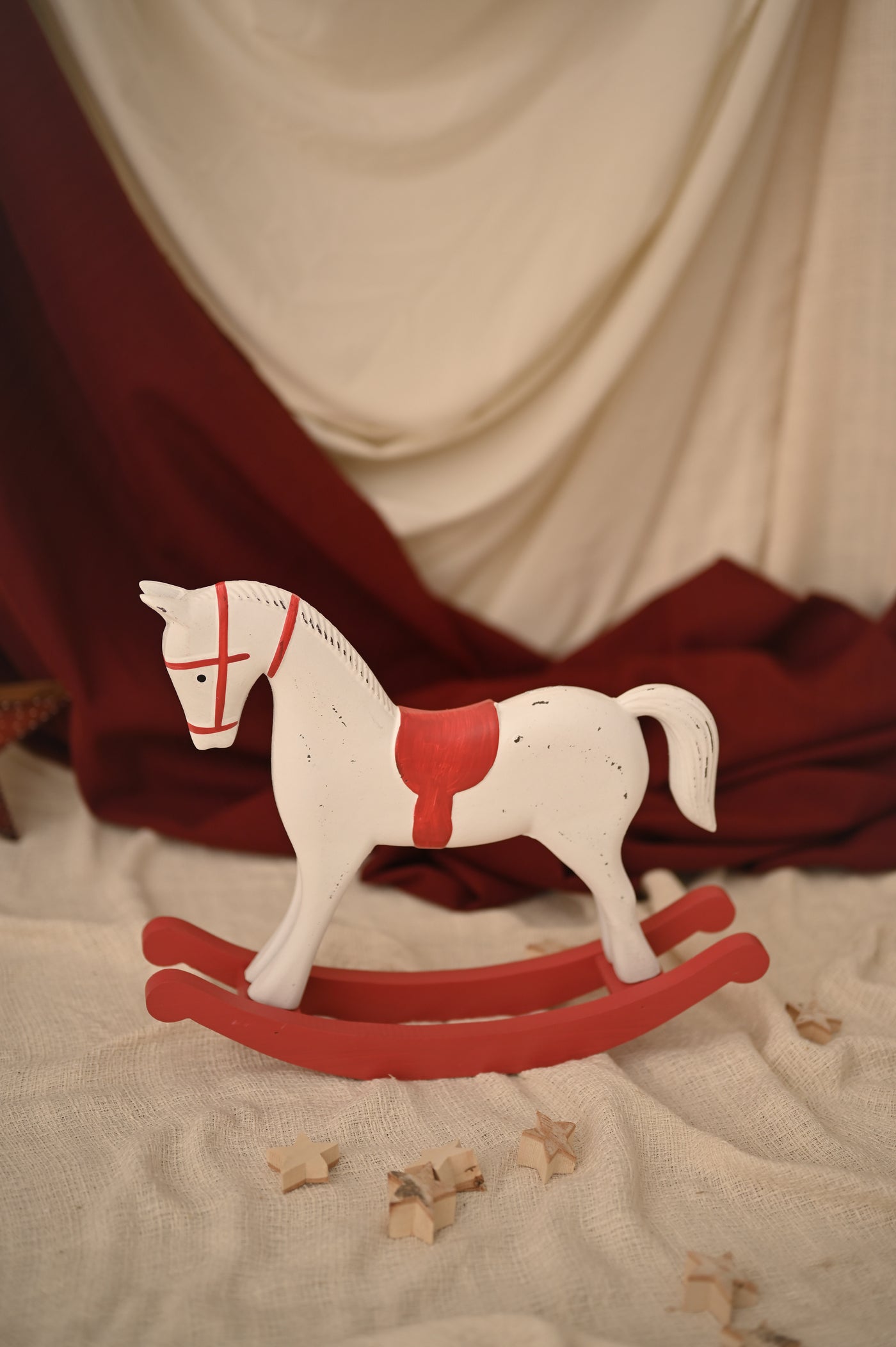 Caballo de madera decorativo, diseño blanco y rojo. Muy llamativo, ideal como centro de atención en sesiones de fotos navideñas y fondos creativos. Prop perfecto para fotógrafos que buscan un toque especial y festivo en sus imágenes.