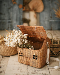 A los peques y no tan peques les va a encantar! Mantenlos entretenidos mientras les haces fotos, sin miedo a que desentone. Esta casa de juguete hecha de ratán con asa puede abrirse por el tejado y usarse de juguete o como decoración o almacenaje. ¡Es una monada!